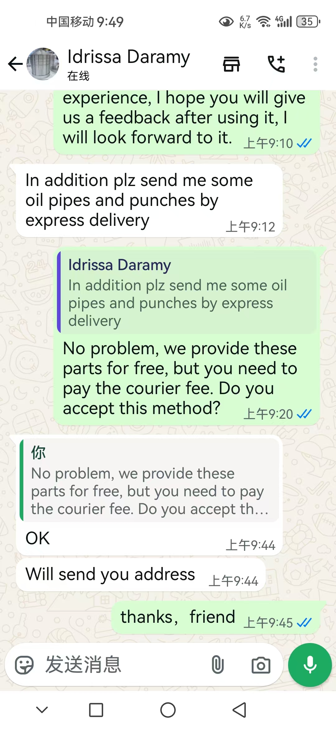 We provide a one-year warranty on the entire machine (including wearing parts). We also provide lifetime support and spare parts supply.