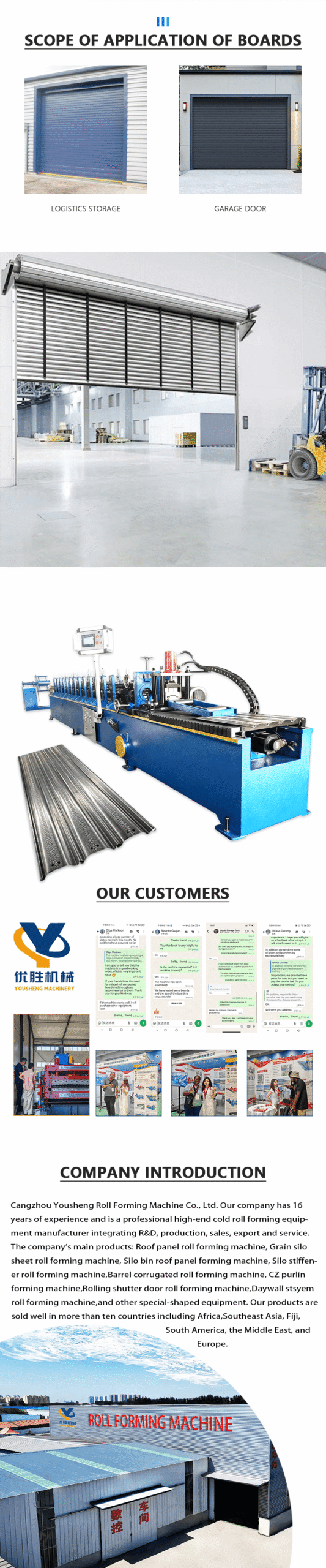 The metal rolling shutter door forming machine produced by Yousheng is an automated machine specifically designed for the continuous processing of metal sheets. The raw material undergoes multiple rolling and forming steps, ultimately forming metal rolling shutter curtain slats that meet the structural specifications of the metal rolling shutter door.